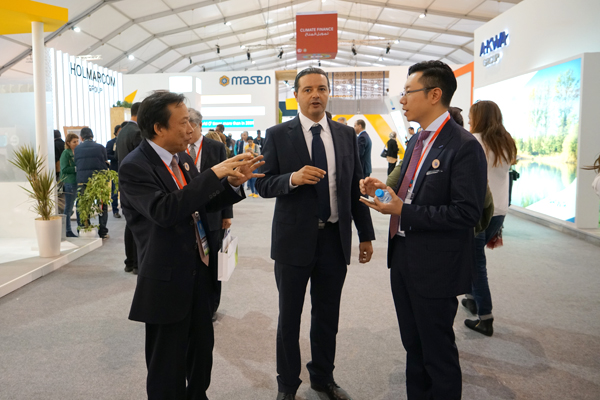 ??? 11月8日上午,在摩中商會(huì )、摩洛哥外貿銀行、香港匯盛資本等機構負責人的陪同下,紀勤應總經(jīng)理一行參觀(guān)了聯(lián)合氣候大會(huì )主展館。展會(huì )現場(chǎng)來(lái)自世界各地節能環(huán)保產(chǎn)業(yè)技術(shù)展示、部分獨具匠心的展臺設計展現出的世界各國實(shí)現綠色循環(huán)低碳發(fā)展,推進(jìn)清潔能源、可再生資源,應對氣候變化、追求美好未來(lái)的決心等給考察團一行留下了深刻的印象。